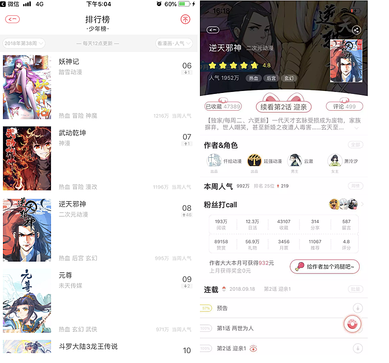 凭借《逆天邪神》这一超级网文的强大号召力以及漫画机构高超的改编能力,《逆天邪神》漫画甫一上线,就展现出惊人的爆发力。上线第一天,该漫画就迅速跻身各漫画平台人气排行榜前列。在看漫画APP上,该漫画获得了4.8的高分,人气高达1952万,排名全站第25 ,人气火爆 ,影响力惊人,后续潜力不容小视。